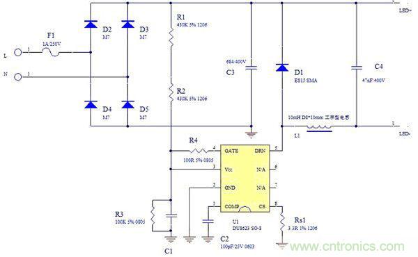 全閉環(huán)控制,檢測輸出電流,來發(fā)出PWM信號,是真正的恒流電源驅動控制技術。實驗表明,相對于其他非閉環(huán)的方案,這種獨有的閉環(huán)恒流控制技術使輸出電流精度有了質的飛躍,使整機電源在全電壓、全負載、電感變化范圍內的電流精度達到行業(yè)內目前最高的±0.9%.基于此閉環(huán)控制技術,DU8623集成1A高壓MOSFET,并且根據(jù)某些應用要求省略了電解電容,這就提供了一種高恒流精度,低成本、壽命優(yōu)化的產(chǎn)品。