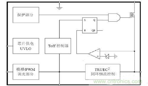 所謂開環(huán),不以檢測到的輸出電流值來做發(fā)出PWM信號的參考。所謂的閉環(huán),即真正檢測輸出電流值,以此為標準來發(fā)出PWM信號。從電路拓撲上,二者沒有區(qū)別。但是在芯片內部對檢測到的如圖1 CS腳電感電流信號,做專利技術處理,如圖2 TRUEC2部分。這樣,就檢測到了電感電流的平均值,也就是輸出電流的平均值。芯片針對檢測到的值,控制輸出占空比,實現(xiàn)了閉環(huán)控制。