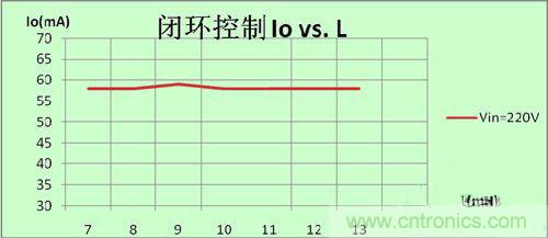 圖4可見,線性調整率為0,因為全閉環(huán)控制逐周期精確控制,輸入有任何變化,芯片會馬上檢測到并作相關的調整以便得到同樣的輸出;同理,如圖5及圖6,當輸出電壓變化,電感量變化時,芯片也會作相關的調整;正是因為我們的全閉環(huán)高精度恒流控制方法,使電源做到了真正的恒流。這樣,量產(chǎn)的一致性可以控制到小于±1%.