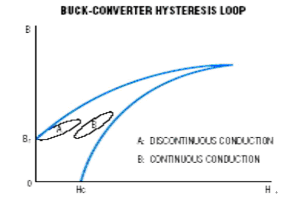 磁芯損耗主要是由于磁滯現(xiàn)象以及磁芯內(nèi)部傳導率或其他非線性參數(shù)的互感產(chǎn)生。在Buck拓撲結(jié)構(gòu)中,第一象限的B-H磁滯回線對磁芯損耗影響最大。在第一象限這個局部圖中,磁滯回線顯示了電感從初始電感量過渡到峰值電感量再回到初始電感量的過程。如果開關(guān)電源穩(wěn)定工作在不連續(xù)狀態(tài),磁滯回線會從剩余電感量(Br)過渡到峰值電感量(參考圖1)。如果開關(guān)電源工作在連續(xù)狀態(tài),那么磁滯回線將會從直流偏置點上升到曲線峰值,再回到直流偏置點。通過實驗可以確定磁滯回線的精確曲線形狀(基本上是橢圓曲線)。