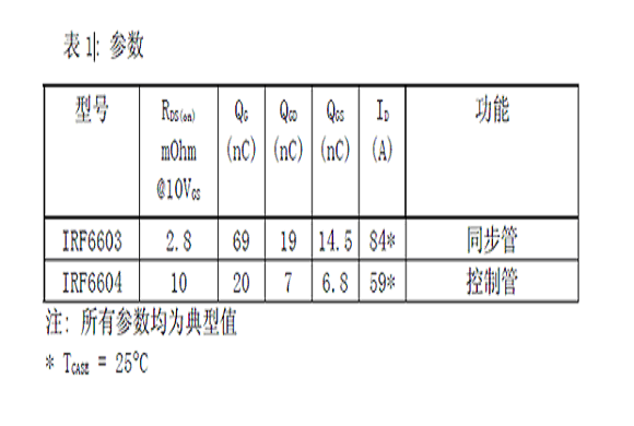 此設(shè)計可以高效輸出超過100A(>25A/相)的電流而面積只有95mm×31mm(3.8inch X 1.25inch )。每項均使用一個控制管和一個同步管的DirectFET MOSFET。用作控制管和同步管的30V DirectFET的規(guī)格見表1。請注意它們高的載流能力省去了器件并聯(lián)的需要。