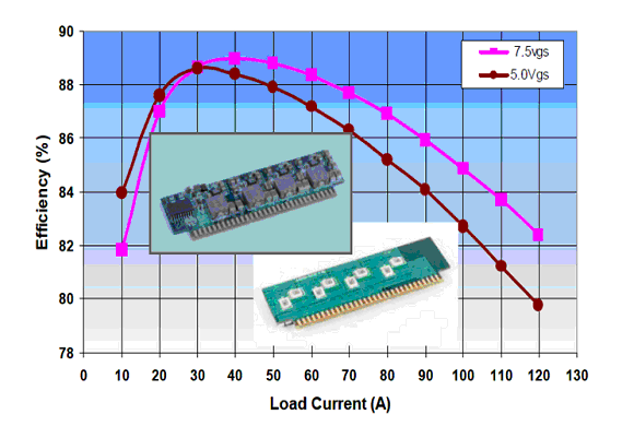 VRM線路板被重新設(shè)計,用4Oz厚覆銅,進(jìn)一步減小PCB走線電阻,改善熱性能。圖2所示為這款4Oz厚覆銅板的VRM,在500KHz工作頻率,12V輸入電壓,1.7V輸出電壓,600LFM風(fēng)冷的條件下的效率曲線。在一個很寬的負(fù)載電流范圍內(nèi),7.5V柵驅(qū)動電壓表現(xiàn)出更高的效率。此款VRM在最大負(fù)載電流120A時,效率達(dá)到82%。