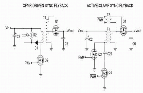 圖1-兩種電源均使用了次級(jí)同步整流,但是左邊的電源使用電源變壓器來(lái)驅(qū)動(dòng)同步 FET,而右邊的電源則使用一個(gè)柵極驅(qū)動(dòng)變壓器并且還采用了一個(gè)有源鉗位。