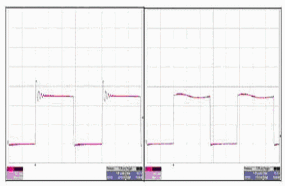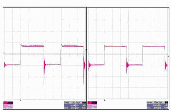 如圖 6 所示,您可以通過(guò)變壓器二次級(jí)電壓對(duì)這兩種設(shè)計(jì)進(jìn)行更多的區(qū)分。表面看來(lái),這兩個(gè)波形極為相似。進(jìn)一步檢查的話,您就會(huì)發(fā)現(xiàn)傳統(tǒng)同步反向電源的負(fù)振鈴要比有源鉗位反向電源的負(fù)振鈴嚴(yán)重很多。該振鈴是由同步 FET 關(guān)閉延遲引起的,通常出現(xiàn)在主 FET 轉(zhuǎn)換開(kāi)啟的時(shí)候。請(qǐng)注意,同步 FET 的柵-源關(guān)閉電壓與反向次級(jí)繞組電壓相同。在變壓器次級(jí)電壓變?yōu)樨?fù)值的同時(shí),同步 FET 必須完全關(guān)閉(實(shí)現(xiàn)這一操作比較困難),否則就會(huì)出現(xiàn)直通現(xiàn)象??刂破黩?qū)動(dòng)的柵極驅(qū)動(dòng)信號(hào)有源鉗位設(shè)計(jì)確保了同步 FET 在主 FET開(kāi)啟之前被關(guān)閉,并減少了電壓振鈴。這也影響了對(duì)同步 FET 的選擇。與傳統(tǒng)的同步反向電源相比較,有源鉗位設(shè)計(jì)可以使用一個(gè)帶有更低 Rdson 的緩?fù)?FET。由于 FET 主體二極管的反向恢復(fù),有源鉗位的同步 FET 上仍然會(huì)出現(xiàn)少許振鈴現(xiàn)象。