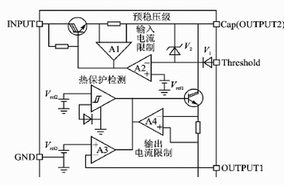 從圖1中還可以看出,VB409還有輸入、輸出電流的限制和熱保護(hù)功能。其作用在于:一方面當(dāng)輸出短路時限制電流的輸出;另一方面當(dāng)過載時關(guān)斷芯片。
