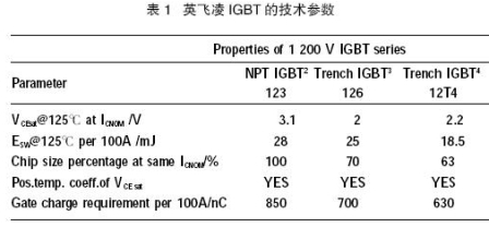 英飛凌的3 個主要IGBT 技術系列的最重要的專用參數(shù)如表1 所列,它們都為1 200 V SEMI原TRANS模塊所使用。