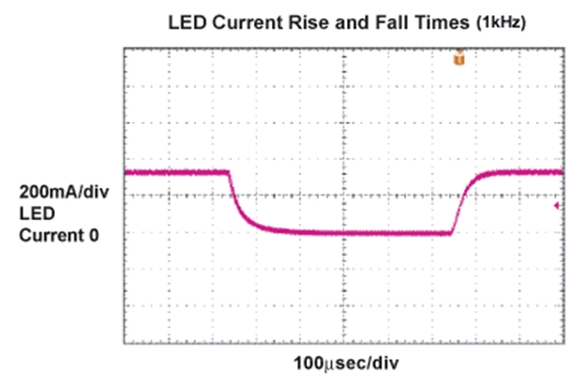 控制LED燈源亮度的最好辦法是通過一個低頻PWM脈沖調(diào)制LED電流。使用這種方法,LED電流根據(jù)占空比的變化觸發(fā)脈沖,同時保持電流幅度恒定。這樣,器件發(fā)出的光波波長在整個調(diào)節(jié)范圍內(nèi)保持不變。