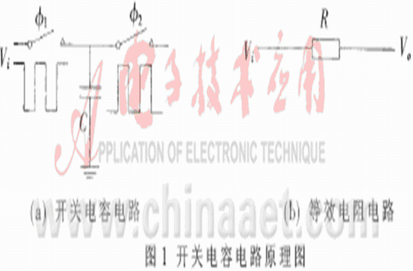開關(guān)電容電路的基本原理是在電路兩節(jié)點(diǎn)之間接有帶高速開關(guān)的電容器,效果相當(dāng)于一個(gè)電阻。其結(jié)構(gòu)圖和等效電阻電路如圖1所示。開關(guān)控制信號φ1和φ2為兩相非重疊的時(shí)鐘(圖1(a)給出了頻率為fCLK的兩相非重疊時(shí)鐘信號波形)。