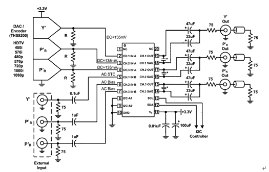 AC偏置非常簡單。THS73x3有兩個電阻,其可在電源和接地間創(chuàng)建分壓器。該模式的輸入阻抗為20kΩ,因此所用的電容應(yīng)足夠大,以盡可能減小傾斜或下垂問題。該模式最適用于Chroma或色差信號,也可用于Luma信號、G’B’R’信號或計算機(jī)的R’G’B’信號。由于信號為AC耦合,且DC偏置點與平均信號電平有差異,因此對于帶5V電源同步信息的信號而言,我們最好用AC偏置模式,以確保沒有剪切問題發(fā)生。