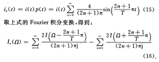 特別注意,求和式是一周期為2T的周期方波p(t)與單位階躍信號(hào)ε(t)的乘積,對(duì)上式取Fourier積分變換即得到開關(guān)電容電路系統(tǒng)頻譜函數(shù)(用j表示虛數(shù)單位,下同):