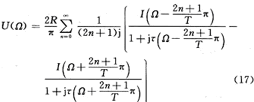 上式說明,Ie(Ω)是輸入電流頻譜I(Ω)周期延拓的組合,周期為Ω0=2π/T。各電流分量流過RC并聯(lián)支路時(shí)的電壓為相應(yīng)電流分量與RC支路阻抗(R/(1+jωτ),ω=Ω±(2n+1)π/T)的乘積,于是輸出電壓頻譜U(Ω)為: