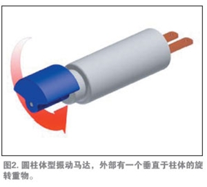 柱型馬達(dá)是采用傳統(tǒng)軸向設(shè)計(jì)的簡(jiǎn)單有刷電機(jī),如圖2所示。用于多種應(yīng)用中,但由于體積較大,不適合在手機(jī)中應(yīng)用。柱型馬達(dá)在手機(jī)中需要較大的空間,直徑是所有振動(dòng)馬達(dá)中最大的。