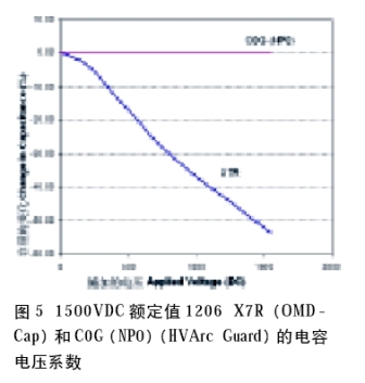 高壓電容器通常是采用X 7 R 和C0G 電解質(zhì)制造的。這些名稱描述了在-55~+125℃溫度系數(shù)將分別為美國電子工業(yè)協(xié)會(EIA)的±15%和±30×10-6/℃。C0G電容器也可以用更常用的術(shù)語表示,即NP0(正負零)。不過,值得注意的是,在1kHz條件下以1Vrms進行電容測量非常重要,各種材料可以用這些名稱來描述。對許多電源應用來說,重要的是知道在某個具體電壓下的電容容量。X7R和C0G(NP0)電容器之間存在顯著的差異;施加了DC電壓的X7R電容器將釋放出大量容量,而C0G(NP0)電容仍然沒有太大的變化。出現(xiàn)這種現(xiàn)象是由于與C0G(NP0)電解質(zhì)的鐵電性質(zhì)相比,鐵電X 7 R 材料在剩余極化(remnant polarization)方面有根本的不同。實際上,雖然X7R MLCC具有高得多的容量,但是其容量在施加DC電壓時會顯著下降。這方面的一個例子如圖5所示。因此,當采用多層電容器時,設計人員必須考慮到施加電壓下的可用容量。