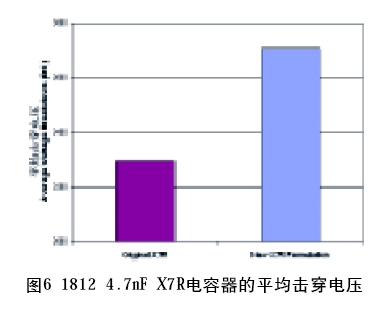 如前面敘述的那樣,有許多材料可以滿足X7R或C0G(NP0)的這類TCC要求。這些材料與各種設計的組合并不能在施加的DC電壓下以完全相同的方式實現(xiàn)。不同制造商任何給定電壓的可用容量一定會有很大的差異。較高的電壓可以與X 7 R 電解質(zhì)中的鐵電疇(ferroelectric domain)相耦合,在元件上產(chǎn)生一種機械應力。這種“壓電應力”會導致電容器在z方向上若干微米的移動。當然,這是根據(jù)壓電執(zhí)行器的原理,但是在MLCC的情況下,連續(xù)的電壓尖峰會導致應力裂紋和故障。為了解決這個問題,應該使用這種具有降低壓電耦合能力的2000VDC 以上額定值的X7R電解質(zhì)電容器。降低耦合系數(shù)的影響可以增加擊穿耐壓,如圖6所示。這些設計采用了完全相同的有效厚度和“浮動電極”型設計。唯一的差異在于X7R電解質(zhì)的新制劑方面的修改,它可以減少與施加電壓的耦合。這種新制劑已用于我們的高壓OMD-Cap產(chǎn)品線。