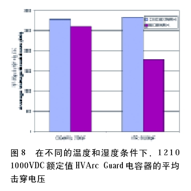 如前面提到的那樣,電容器或電路板涂層可以防止表面弧,而且還可以作為一種防潮的屏障。為了測試HVArc Guard元件對由濕度引起的故障的易感性,對1210外殼尺寸、1000VDC額定值的MLCC樣品進行了擊穿電壓測試,其環(huán)境條件為23.8℃/53.3%RH,提高的溫濕度為85℃/85%RH。其結(jié)果如圖8所示。盡管在85/85條件下X7R的平均擊穿電壓相當?shù)?,但C0G(NP0)幾乎不受影響。因此,C0G(NP0)看似不那么易受潮濕所引起故障的影響,而兩種情況的擊穿都是在容許范圍以內(nèi),即使是在高濕度條件下。兩種環(huán)境條件下測試的元件擊穿范圍均高于額定電壓。