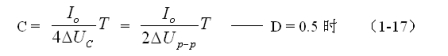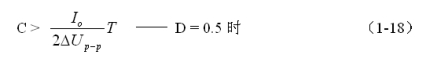 (1-17)和(1-18)式,就是計算串聯(lián)式開關電源儲能濾波電容的公式(D = 0.5時)。式中:Io是流過負載的電流,T為控制開關K的工作周期,ΔUP-P為輸出電壓的波紋。電壓波紋ΔUP-P一般都取峰-峰值,所以電壓波紋正好等于電容器充電或放電時的電壓增量,即:ΔUP-P = 2ΔUc 。