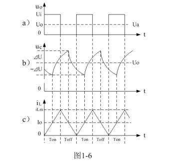 圖1-6是串聯(lián)式開關電源工作于臨界連續(xù)電流狀態(tài)時,串聯(lián)式開關電源電路中各點電壓和電流的波形。圖1-6中,Ui為電源的輸入電壓,uo為控制開關K的輸出電壓,Uo為電源濾波輸出電壓,iL為流過儲能濾波電感電流,Io為流過負載的電流。圖1-6-a)是控制開關K輸出電壓的波形;圖1-6-b)是儲能濾波電容C的充、放電曲線圖;圖1-6-c)是流過儲能濾波電感電流iL的波形。當串聯(lián)式開關電源工作于臨界連續(xù)電流狀態(tài)時,控制開關K的占空比D等于0.5,流過負載的電流Io等于流過儲能濾波電感最大電流iLm的二分之一。