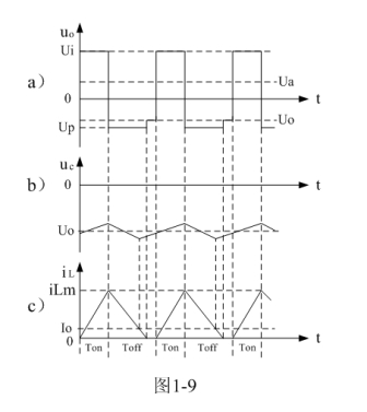 圖1-8、圖1-9、圖1-10分別是控制開關(guān)K的占空比D等于0.5、< 0.5、> 0.5時,圖1-7電路中幾個關(guān)鍵點的電壓和電流波形。圖1-8-a)、圖1-9-a)、圖1-10-a)分別為控制開關(guān)K輸出電壓uo的波形;圖1-8-b)、圖1-9-b)、圖1-10-b)分別為儲能濾波電容兩端電壓uc的波形;圖1-8-c)、圖1-9-c)、圖1-10-c)分別為流過儲能電感L電流iL的波形。應(yīng)該特別注意的是,圖1-8-c)、圖1-9-c)、圖1-10-c)中的電流波形按原理應(yīng)該取負(fù)值,但取負(fù)值后與前面圖1-5與圖1-6對比反而覺得不好對比和分析,因此,當(dāng)進(jìn)行具體計算時,一定要注意電流和電壓的方向。[page]