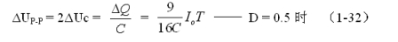 (1-33)和(1-34)式,就是計算反轉(zhuǎn)式串聯(lián)開關(guān)電源儲能濾波電容的公式(D = 0.5時)。式中:Io是流過負(fù)載電流的平均值,T為開關(guān)工作周期,ΔUP-P為濾波輸出電壓的波紋,或電壓紋波。一般波紋電壓都是取電壓增量的峰-峰值,因此,當(dāng)D = 0.5時,波紋電壓等于電容器充電的電壓增量,即:ΔUP-P = 2ΔUc 。