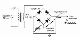 PolySwitchTM元件在便攜式電子產(chǎn)品適配器(外接電源)中的過流保護如圖6所示。圖中結(jié)構(gòu)用了兩個PolySwitchTM器件,可防止短路時損壞適配器。