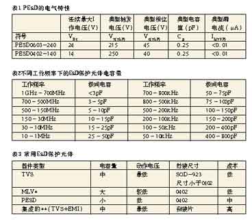 不同工作頻率及要求ESD保護元件的電容量關(guān)系如表2所示。常用的ESD保護元件比較如表3所示。[page]
