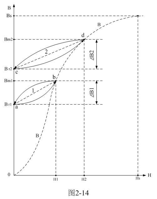 在圖2-14中,虛線B或0-B-B為變壓器鐵芯的初始磁化曲線;當(dāng)輸入直流脈沖的幅度比較低,或脈沖寬度比較窄時,磁通密度由Br1沿著磁化曲線a-b上升,到達(dá)Bm1后脈沖結(jié)束,然后磁通密度由Bm1沿著磁化曲線b-a下降回到Br1,虛線1是其等效磁化曲線。