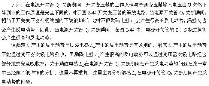 (2-140)式對(duì)于計(jì)算漏感 產(chǎn)生的反電動(dòng)勢(shì)或其它電感產(chǎn)生的反電動(dòng)勢(shì)同樣有效。漏感 中存儲(chǔ)的能量可根據(jù)(2-138)式求得;而流過漏感 的電流,對(duì)于反激式開關(guān)電源:可認(rèn)為與勵(lì)磁電流的大小基本相等,因?yàn)?,在反激式開關(guān)電源中,等效負(fù)載電阻等于無限大;對(duì)于正激式開關(guān)電源:可認(rèn)為與流過等效負(fù)載電阻的電流大小基本相等,因?yàn)?,在正激式開關(guān)電源中,勵(lì)磁電流相對(duì)于流過等效負(fù)載電阻的電流,很小。