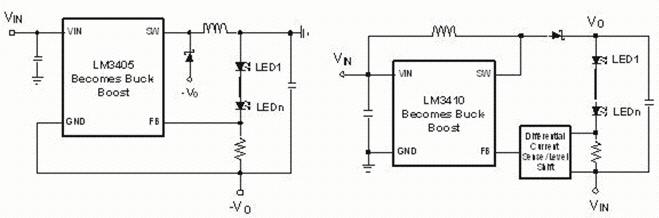 單電感Buck-boost可以像Buck或Boost調(diào)節(jié)器一樣組建,使它在系統(tǒng)成本的角度來講很吸引人。這種拓?fù)涞囊粋€(gè)缺點(diǎn)是Vo被反置(圖2a)或者以VIN為參照(圖2b)。測平移動(dòng)或者反偏電路必須要用一些轉(zhuǎn)換器。像boost轉(zhuǎn)換器,它們有一個(gè)不連續(xù)輸出電流,并且需要一個(gè)輸出電容來維持一個(gè)持續(xù)LED電流。功率MOSFET要承受一個(gè)峰值為IIN加上IF的電流還有一個(gè)峰值為VIN加上VO的電壓。