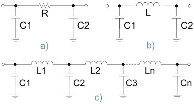 圖1:常見EMI/RFI濾波器類型的結構示意圖:a)π型RC;b)π型LC;c)LC梯形。
