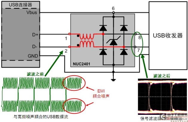 圖5:帶超低電容ESD保護的集成CMC濾波器NUF2401MN用于USB2.0等高速應用。