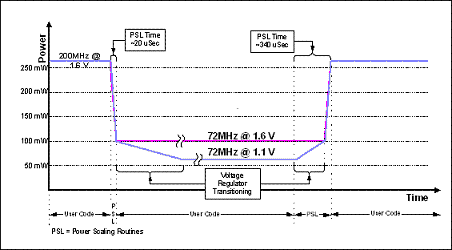一般來說,內(nèi)核電壓會保持為1.6V。不過我們也可用功率調(diào)整程序庫安全地將電壓降至1.2V,從而在算法不運行期間使功耗進一步降低30mW。