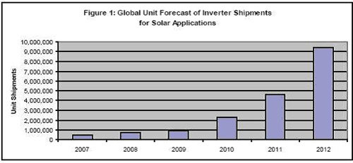- 2012年全球用于太陽(yáng)能系統(tǒng)的逆變器出貨量將從2008年時(shí)的723,329個(gè)增長(zhǎng)到950萬(wàn)個(gè)