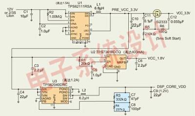 我們構(gòu)建了若干個電源管理參考設(shè)計(jì),并進(jìn)行數(shù)字音頻/視頻應(yīng)用的測試。這些設(shè)計(jì)均采用TI的TMS320DM6?43和TMS320DM6?46處理器,這些處理器能滿足排序、電壓精度和啟動要求。圖1是12V電源的參考設(shè)計(jì)電路圖。該設(shè)計(jì)采用TPS62111同步降壓轉(zhuǎn)換器、TPS62040同步降壓轉(zhuǎn)換器以及TPS73618低壓降調(diào)節(jié)器,它們分別提供3.3V、1.2V和1.8V電壓軌。這種參考設(shè)計(jì)包含一個簡單的外部MOSFET、電阻和電容延遲電路,以使3.3V電壓軌能滿足自升壓模式排序方案要求。TPS62040不但提供1.2V的內(nèi)核電壓,而且還可滿足引腳5軟啟動電容的排序要求。這種解決方案的容差為±3%,效率在90%以上。為滿足主機(jī)升壓模式排序方案要求,可以將一個類似的MOSFET、電阻以及電容電路增加到1.2V電壓軌。