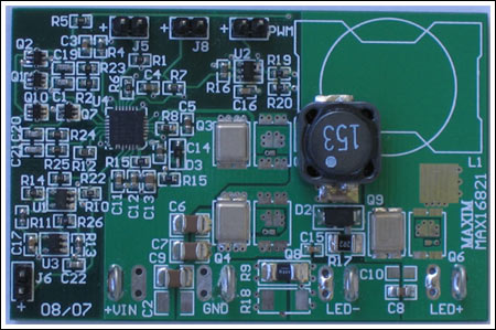 圖1. MAX16821 LED驅(qū)動(dòng)器電路板