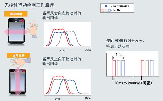 Rohm公司的另一個(gè)重要的產(chǎn)品是單片光學(xué)式接近傳感器/照度傳感器芯片BH1771GLC。Rohm公司設(shè)計(jì)中心所長福田明介紹,“BH1771GLC在單芯片上安裝有檢測可見光的光電二極管和檢測紅外光的光電二極管,在感知1cm ~ 10cm 程度的接近的同時(shí),作為照度傳感器可以檢測0 ~ 65,000Lux。而且,擴(kuò)大距離傳感器功能,安裝了業(yè)界首創(chuàng)無接觸動(dòng)作檢測功能。所謂無接觸動(dòng)作檢測,即以BH1771GLC驅(qū)動(dòng)多個(gè)紅外線LED(最多3 個(gè)),檢測各個(gè)LED 的反射光相位偏差,并感知反射物(人的手)的動(dòng)作方向的功能。如果使用這一功能,不需要直接接觸顯示器,在距離顯示屏5cm 左右的高度通過揮手動(dòng)作也能操作。借此,即使沒有安裝觸摸顯示屏的顯示器設(shè)備也可以進(jìn)行動(dòng)作操作。”可以想象,采用該方案過后,不用接觸屏幕或按鍵就可以實(shí)現(xiàn)翻頁、換歌,或?yàn)g覽網(wǎng)頁的功能,這對手機(jī)制造商來說無疑是個(gè)絕佳的創(chuàng)新賣點(diǎn)。