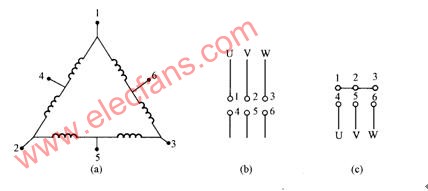 其中,(a)圖為結(jié)構(gòu)示意圖,改變接線方法可獲得兩種接法,(b)圖為三角形接法,磁極對數(shù)為2對極,同步轉(zhuǎn)速為1500r/min,是一種低速接法;(c)圖為雙星形接法,磁極對數(shù)為1對極,同步轉(zhuǎn)速為3000r/min,是一種高速接法。