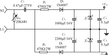 輸入電路的電阻R1(或R1、R2)要采用品質(zhì)較好的金屬膜電阻或水泥電阻,功率2~5W,阻值100~820Ω;降壓電容C2(或C5)采用高質(zhì)量的高壓金屬化聚丙烯電容,一般0.22~0.47μF,耐壓應(yīng)≥AC250V,電容的容量過大會引起視在功率超標。