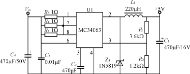 如果保證在最低輸入電壓70%Rn時電表能輸出正常的工作電壓,按線性變壓器特性,則在額定輸入電壓Un時,輸出電壓會較高,如果輸出電壓整流濾波后采用一般的線性穩(wěn)壓器供電,將會使整機功耗加大;而在最高輸入電壓時,將會使變壓器溫升增大,線性穩(wěn)壓電路損耗加大,發(fā)熱量也會增大;針對整機耗電較大的電子電度表,其解決辦法一是可以采用較好材質(zhì)的硅鋼片,如Z11型硅鋼片;二是低壓輸出穩(wěn)壓電路采用一個低成本的高效率DC/DC變換電路,即可使整機功耗顯著降低,還可在寬輸入電壓范圍內(nèi),穩(wěn)定、高效地工作。這些DC/DC電路可以采用簡單的低成本MC34063、LM2574等DC/DC變換器,采用MC34063設(shè)計的+5V輸出DC/DC變換器如圖3所示。