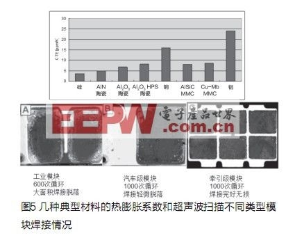 IGBT模塊由多層不同材料組成(見圖3),每種材料具有不同的CTE(熱膨脹系數(shù)),CTE的差別會影響功率模塊的使用壽命,當(dāng)模塊使用時,溫度的變化會在不同層間產(chǎn)生機械應(yīng)力而導(dǎo)致焊接脫落,我們的目標(biāo)是選用熱膨脹系數(shù)差別盡可能小的材料來進(jìn)行焊接組合。但另一方面,即使它們的熱膨脹系數(shù)十分匹配,因為材料本身的成本可能會太高,或者在生產(chǎn)過程中難以被加工或加工成本太高。例如列車牽引應(yīng)用中的AlSiC基板。熱膨脹系數(shù)和襯底幾乎相同,因此有更好的熱循環(huán)特性。但對混合動力車應(yīng)用因成本過高而很難被接受。