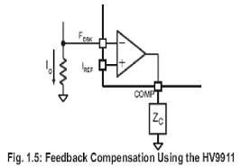 閉回路控制的形成是連接輸出電流信號至FDBKpin,同時將電流參考位準連接至IREFpin,補償網(wǎng)絡(luò)連接至Comppin(傳導(dǎo)運算放大器的輸出端),如圖5所示。放大器的輸出受PWM調(diào)光信號所控制,當(dāng)PWM調(diào)光信號為High時放大器的輸端連接至補償網(wǎng)絡(luò),當(dāng)PWM調(diào)光信號為Low時,放大器的輸出端與補償網(wǎng)絡(luò)被切斷,因此補償網(wǎng)絡(luò)內(nèi)的電容電壓維持住,一直到PWM調(diào)光信號再度回復(fù)High準位時,補償網(wǎng)絡(luò)才又連接圖放大器的輸出端,這樣可確保電路動作正常以及獲得非常良好的PWM調(diào)光反應(yīng),而不需要設(shè)計一個快速的控制電路。