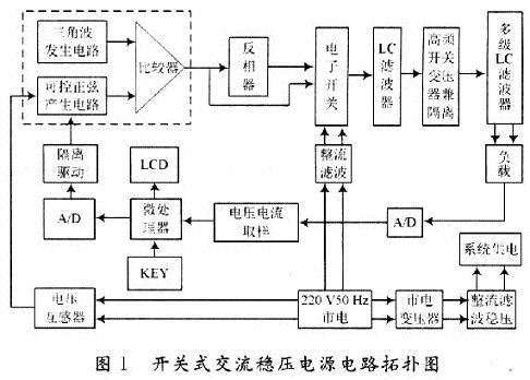 電壓和電流取樣電路從負載上獲取電壓和電流信號,分別送兩路A/D轉換器轉換,變成離散的數字信號。一方面用于通過微處理器處理后進行實時顯示;另一方面用于通過微處理器處理后送D/A轉換器變換為模擬量,經過光電隔離驅動電路來控制正弦波發(fā)生器的幅值,又經過比較器、反向器、高速電子開關、LC濾波、高頻開關變壓器、多級LC濾波等電路,用于控制負載上電壓或電流的穩(wěn)定。電壓互感器的作用是從市電中獲得低諧波失真的標準正弦波,經由正弦波產生電路控制其幅值;鍵盤用于輸入準備向負載提供的電壓或電流值。
