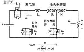 但是,在圖2所示的采用抽頭電感器(TapInductor)的降壓型轉(zhuǎn)換器中,即使不采用非常小的時間比也能夠獲得很大的降壓比。雖然當抽頭電感器的繞組之間存在漏電感時會產(chǎn)生非常大的浪涌電壓,但由于采用了有源鉗位(ActiveClamp)電路,故使得浪涌電壓受到抑制。