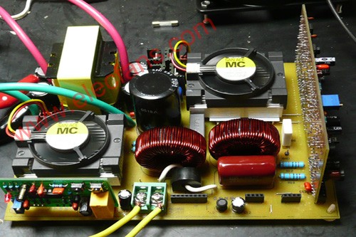 本機前級功率管和H橋的功率管都用風扇散熱(安裝方法下面再詳述),這是一種小型儀表風扇,比電腦上的CPU風扇還要小一點,實驗證明,在600W輸出的情況下,H橋的4個功率管散熱不成問題,但前級的二個功率管好象散熱不夠一點,如果有可能,最好用大一點的風扇。
