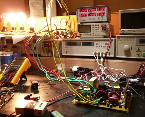 這里,可以稍稍為前級加點負載,可以用二個100W220V的燈泡串聯(lián)起來,接到高壓解的二端,這時電瓶電流可達到12A左右,讓它工作一段時間,看看前級功率管有沒有溫升,如果溫升不明顯,可以把電瓶保險絲換大點,繼續(xù)加大負載,一般在功率管散熱正常的情況下,前級可以加到600W左右。在加載的情況下,再看D極波形,應該是正常的方波,稍有點尖峰是沒有關系的,如果尖峰過大,說明變壓器制作不過關,要重新繞制。