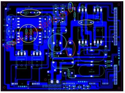 前級推挽部分的供電采用對稱平衡方式,這樣做有二個好處,一是可以保證大電流時的二個功率管工作狀態(tài)的對稱性,保證不會出現(xiàn)單邊發(fā)熱現(xiàn)象;二是可以減少PCB反面堆錫層的電流密度,當然,也可以大大減小因為電流不平衡引起的干擾。高壓整流快速二極管,用的是TO220封裝的RHRP8120,這種管子可靠性很好,我用的是二手管,才1元錢一個。高壓濾波電容是470uf/450V的,在可能的情況下,盡可能用的容量大一些,對改善高壓部分的負載特性和減少干擾都有好處。H橋部分用的是4個IRFP460,耐壓500V,最大電流20A,也可以用性能差不多的管子代替,用內(nèi)阻小的管子可以提高整機的逆變效率。H橋部分的電路采用的常規(guī)電路。