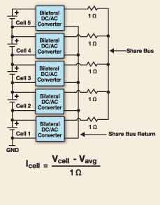 Aeroflex平衡電路使用共享總線,這個(gè)總線的電壓等于所有電池的平均電壓。平衡電路由那些超過(guò)共享總線電壓的電池充電并將電能注入到電壓較低的電池,這個(gè)工作是通過(guò)高效率的雙邊DC/AC轉(zhuǎn)換器來(lái)完成的。