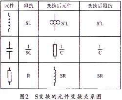 所謂S變換,就是用S乘以R、C、L。其結(jié)果就是把電阻變換為電感,電容變換為電阻,并將電感變換為頻變電阻。但這里的頻變電阻是與S2成正比的。圖2給出了S變換的元件變換關(guān)系圖。