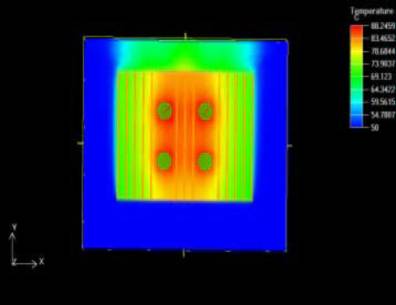 盡管散熱器的參數(shù)優(yōu)化對溫升控制略有改善,但仍不能滿足功率管的可靠性要求,因此,我們考慮強(qiáng)迫風(fēng)冷的散熱方式。在上述計(jì)算模型的基礎(chǔ)上,我們在垂直方向設(shè)定流體的流速為1.5m/s , 即在散熱器底部送風(fēng),其他參數(shù)不變。我們注意到,此時(shí)系統(tǒng)給出的流態(tài)為紊流。在初始條件中作相應(yīng)的調(diào)整后,最終求得的器件表面最高溫度約為89°C。散熱器底板截面溫度圖及橫向風(fēng)速云圖分別見圖2、3。