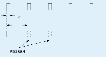 圖1為脈沖跳躍技術(shù)示意圖。當(dāng)負載降低時,驅(qū)動功率開關(guān)的開關(guān)脈沖將被遮蔽(即跳過),部分脈沖被省略也即等效于降低了開關(guān)頻率,可降低高頻開關(guān)帶來的損耗,然而這種降頻方式會造成輸出電壓突降或突升(圖2)。