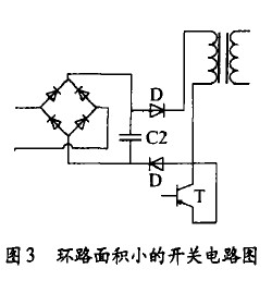 如圖2為環(huán)路面積較大的開關(guān)電路,圖3為環(huán)路面積較小的開關(guān)電路。